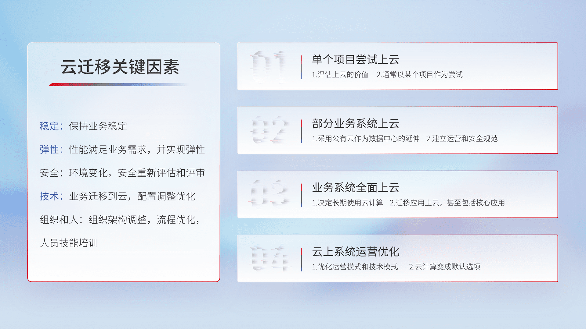 结合实际业务,,从规划设计、、、云平台选型、、云原生改造、、、数据迁移、、、、集成交付,,迁移全过程为客户识别最佳上云路径,,,,做好风险识别管理,,,,设计网络架构、、、身份权限、、、、安全审计合规、、操作审计、、、、日志审计、、、、监控告警策略、、、多站点容灾设计等,,对云上基础设施进行整体规划,,,,提升IT治理水平,,,,以满足弹性、、、高可用、、高性能的需求。。。。